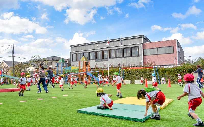 幼稚園の園庭は、園児の安全と運動機能向上を目的として全面エコターフになっております。